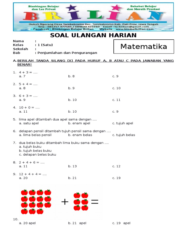22+ Soal Matematika Kelas 1 Sd Penjumlahan Dan Pengurangan